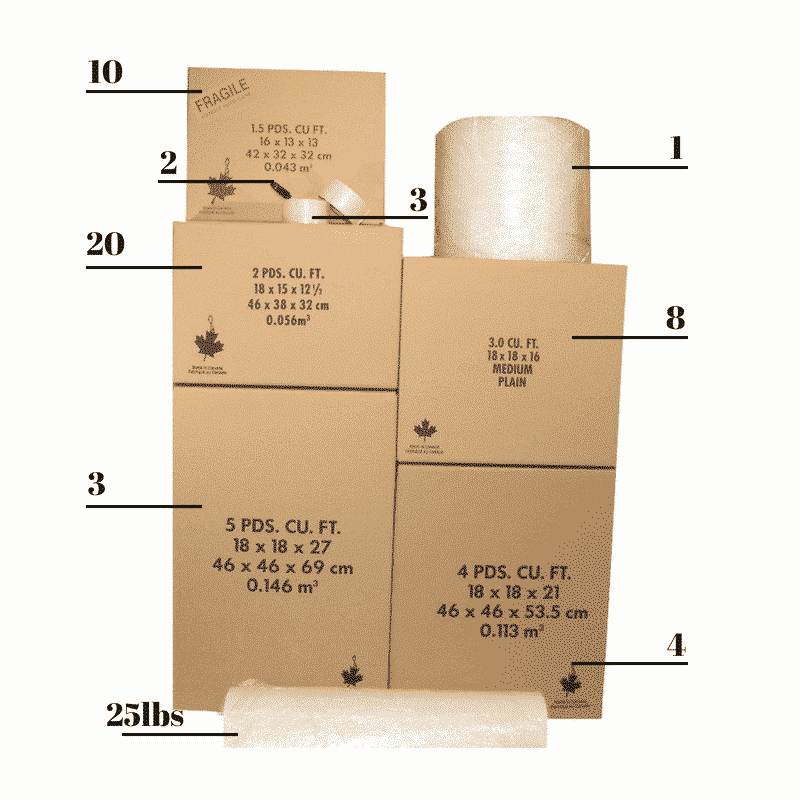 This packing kit is the ideal assortment of moving supplies for a 2 bedroom apartment or condo move. The kit includes 45 boxes of small, medium and large size and other essentials (Bubble Roll, packing paper, tape etc.) which will help you pack, wrap, protect, organize and cushion your items. This kit is conveniently pre-selected for you based on the packing needs of an average 2 bedroom residence.